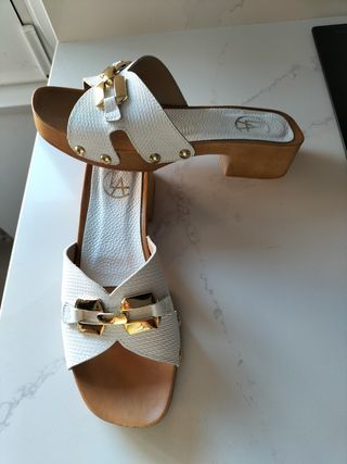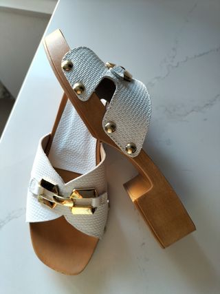 Preciosos zuecos de mujer, ideales para el verano. Son de madera y tienen un diseño elegante y cómodo. - Color blanco y marrón. - Material de la suela: madera. - Diseño con hebilla dorada. - Supercómodos y prácticamente nuevos.