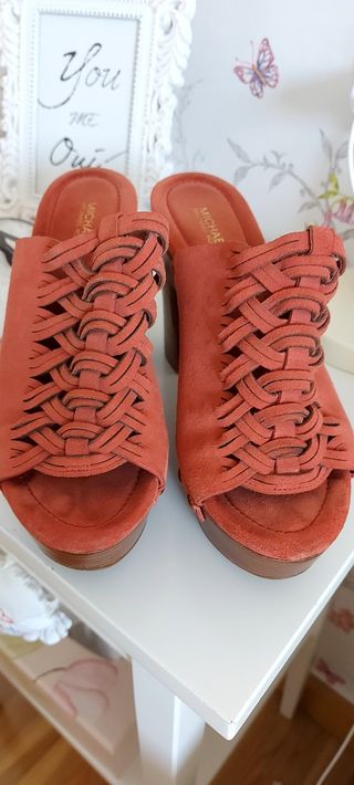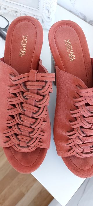 Preciosos zuecos de la marca Michael Kors, talla 38, en color coral. Son de ante y tienen un diseño trenzado muy original. Ideales para verano. - Diseño trenzado - Tacón de madera Usados en un solo momento.