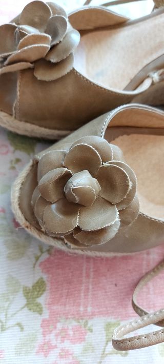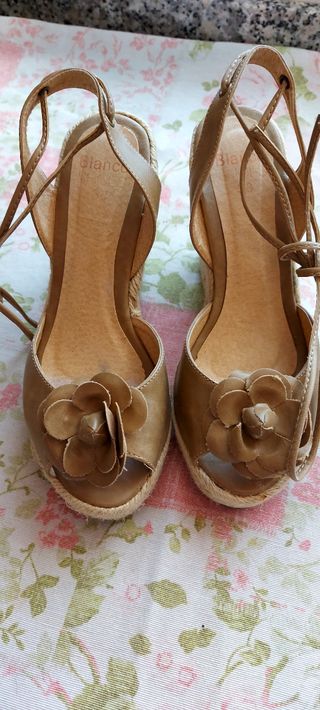 Preciosas cuñas de la marca Blanco. Son de color beige y tienen un diseño de flor en la parte delantera. Ideales para primavera/verano. - Suela de esparto. - Cierre con tiras al tobillo. - En muy buen estado.