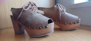 Preciosos zuecos de madera, color beige, talla 40. Ideales para darle un toque especial a cualquier look. - Son de cuero. - Tienen tachuelas metálicas. - Tacón de madera.