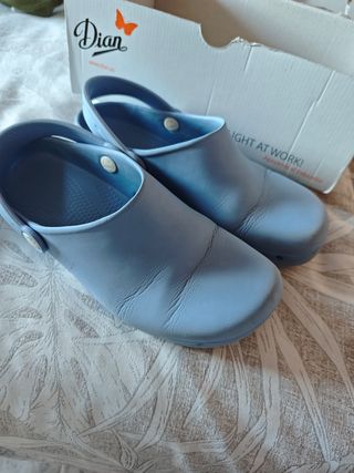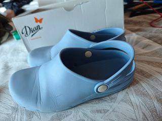 Zuecos de la marca Dian, ideales para personal sanitario. - Diseño cerrado. - Correa ajustable. - Orificios de ventilación laterales.
