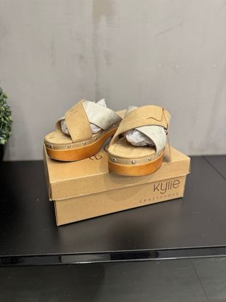 Zuecos de la marca Kylie con un diseño cruzado. - Tira delantera en ante beige. - Tira superior en material plateado. - Plataforma y tacón de madera. - Detalle de tachuelas metálicas alrededor de la suela.