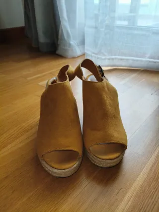 Cuñas de esparto en color mostaza, con diseño abierto en la punta y cerrado en el talón. - Altura de cuña considerable. - Material exterior tipo ante. - Cierre con tira en el tobillo.