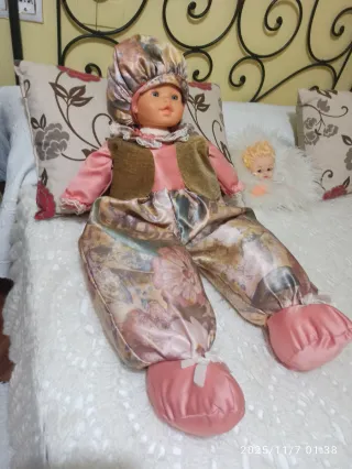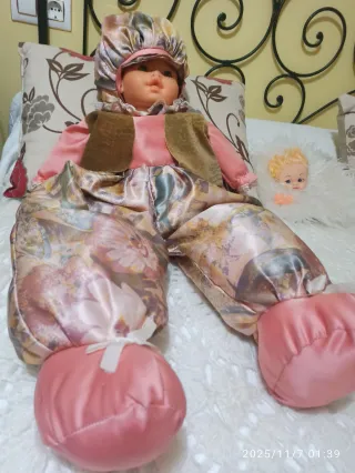 Este muñeco grande tiene un diseño llamativo y divertido. - Traje con estampado floral y detalles en dorado. - Gorro a juego con el traje. - Vestido con chaleco. - Pies grandes y acolchados.