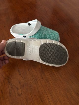 Zuecos sanitarios de la marca Suecos, en color verde azulado y blanco. Han sido usados solo un par de días, por lo que están prácticamente nuevos. - Diseño con estampado de iconos médicos. - Suela interior con relieve para mayor comodidad. - Tira trasera ajustable.