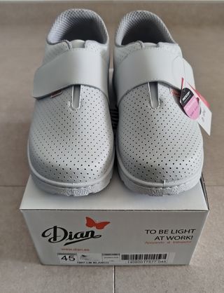 NUEVO SIN ESTRENAR CON ETIQUETAS. Zapatos zuecos para trabajo laboral nuevos color beige y suela blanca talla 39. Marca "Dian" Sanitized especiales para trabajo. Plantilla acolchada de material textil sobre espuma de poliuretano antibacterias y carbón activado. Suela de caucho flexible y antideslizante. Material exterior sintético, perforado y transpirable repelente de líquidos con velcros para mayor comodidad. Zuecos profesionales unisex de la marca DIAN. Son cómodos y transpirables gracias a sus perforaciones. Cierre de velcro. Suela antideslizante.