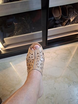 Preciosos zuecos de la marca Wonder, en color beige y talla 40. Son de piel y tienen un diseño elegante y sofisticado. - Tienen un tacón de altura media. - El diseño con perforaciones les da un toque único. - Están en muy buen estado.