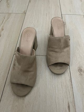 Zuecos de tacón de la marca Guess. - Material: Ante. - Color: Beige. - Diseño abierto. - Tacón grueso.