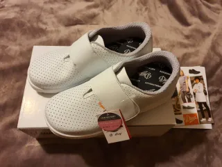 Zapatos de trabajo Dian en color blanco, talla 38. Ideales para el sector sanitario o cualquier otro que precise suela antideslizante Cierre de velcro y diseño perforado para mayor transpiración