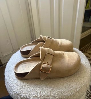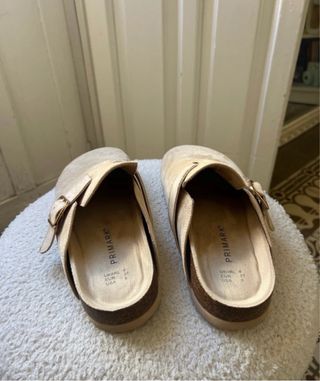 Sandalias tipo zueco de la marca Primark en color beige. - Diseño abierto por detrás. - Correa ajustable con hebilla dorada. - Suela de corcho.