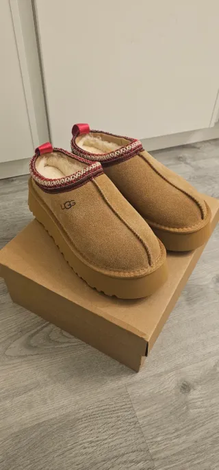 Zuecos de la marca UGG en color marrón, perfectos para estar cómodo en casa. Cuentan con un detalle de ribete trenzado en contraste y tiras rojas. - Interior forrado de pelo sintético. - Suela de goma antideslizante. - Diseño tipo mule abierto por detrás.