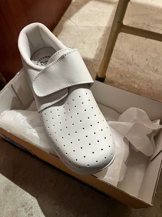 Zuecos cómodos y prácticos para el trabajo. - Talla válida para un 39'5 - Diseño abierto en el talón. - Correa ajustable. - Suela antideslizante y antiestáticos. - precio original del modelo 47€.