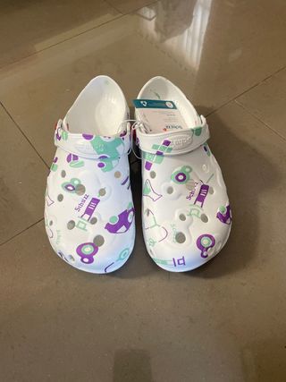 Zuecos blancos con un divertido estampado de dibujos animados en tonos morados y verdes. Perfectos para trabajar en el hospital, centro de salud o la farmacia. O para lo que los necesites