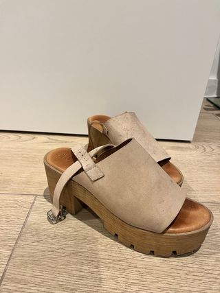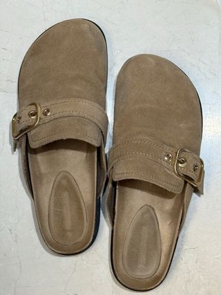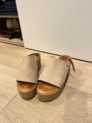 Zuecos tipo mule en tono beige y marrón. Un calzado cómodo y versátil. - Material exterior de ante. - Correa ajustable con hebilla. - Suela de corcho. Puestas un par de veces, están nuevas. Pone 38, pero yo calzo 37, es para un pie de la 37.