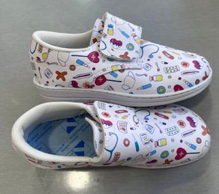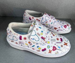 Zuecos de piel con un divertido estampado de motivos médicos. Son cómodos y prácticos. - Estampado multicolor sobre fondo blanco. - Cierre de velcro. - Tallas disponibles: 38, 39, 40.