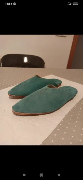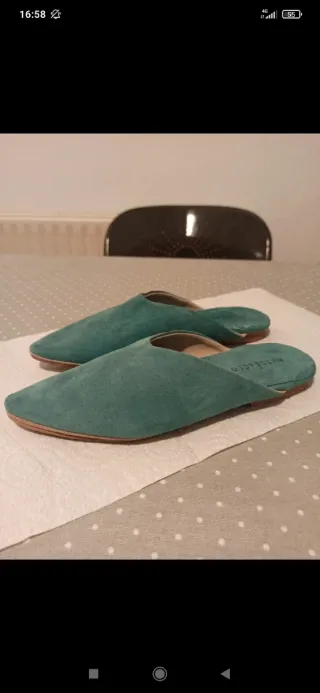 Mules de ante en color verde azulado. Babouches - Diseño de punta fina. - Suela de cuero. En perfecto estado, usado una sola vez 21 cm de punta a talón