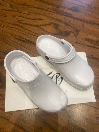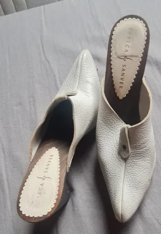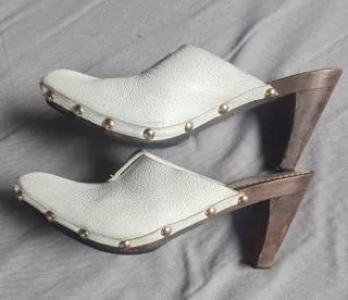 Zuecos blancos número 41, puestos un rato para un disfraz.