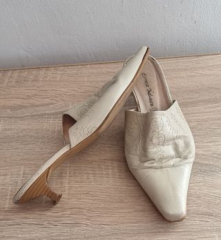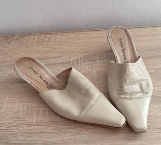 Preciosos zuecos de la marca Esther Nueve, en color beige. Son de tacón pequeño y tienen un diseño elegante con bordados. Están en buen estado, aunque presentan señales normales de uso. - Talla: (Añadir talla) - Material: Piel - Tacón pequeño - Diseño con bordados
