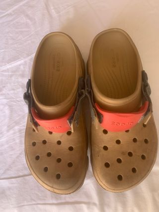 Zuecos “Crocs”. Color beige con la marca en rojo-naranja. Talla M-11. Son originales. Usados pero se pueden utilizar perfectamente, por dentro están perfectos.
