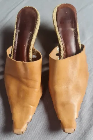 Zuecos de piel con remaches y tacón de madera de 4,5 cm Talla 37 Muy cómodos y ligeros. Tienen un pequeño desperfecto en el tacón del pie izquierdo (última foto). Apenas se aprecia.