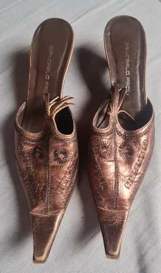 Elegantes zuecos de la marca Giancarlo Paoli en un llamativo color cobre. Perfectos para añadir un toque de estilo. - Diseño de punta fina. - Detalle de flecos en la pala. - Acabado metalizado.