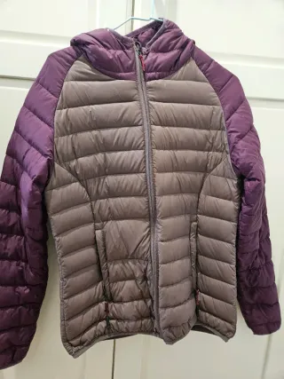 Plumífero Roc para mujer, con un diseño bicolor. - Mangas y capucha en color morado. - Cuerpo principal en tono marrón. - Cierre de cremallera frontal.