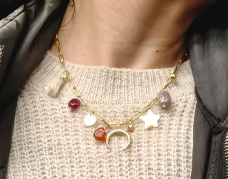 Collar de moda con diferentes charms, bolas y dijes, hechoa a mano: - Dijes de luna, estrella, borla y piedras semipreciosas. - Diseño único Visita mi página de IG: @mari.bitxi #collar #bisuteria #joya #hechoamano #charm