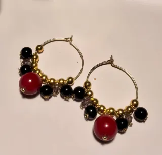 Pendientes de aros con bolas doradas, rojas y negras. Diseño elegante, moderno o llamativo según el look. Hechos a mano Visita mi pagina de IG: mari.bitxi #pendientes #bisuteria #joyita #hechoamano #moda