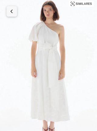 Vestido elegante de fiesta o para novia. Es un vestido precioso y muy cómodo. - Diseño asimétrico con un hombro al descubierto. - Detalle de lazada en la cintura. - Largo midi. -Se ha usado solo 1 vez para sesión de fotos 1 hora. -Precio original 289€.