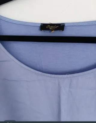 Blusa de manga corta en color celeste, con un diseño moderno y cómodo. - Tejido ligero y fluido. - Detalle de bandas en el bajo. - Cuello redondo.