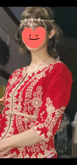 Traje tradicional argelino Karakou, una pieza elegante y festiva. - Chaqueta corta con cremallera frontal. - Bordados dorados intrincados en la chaqueta y el borde de la falda. - Falda larga a juego.