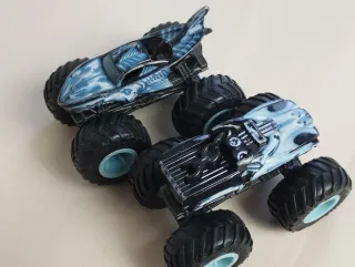Dos camiones monstruo estilo Hot Wheels con diseño de tiburón y calavera. - Diseño detallado de tiburón en uno de los camiones. - Diseño de calavera en el otro camión. - Ruedas grandes de goma. - Colores azul y negro predominantes. Precio por unidad 5€ Los dos 9€