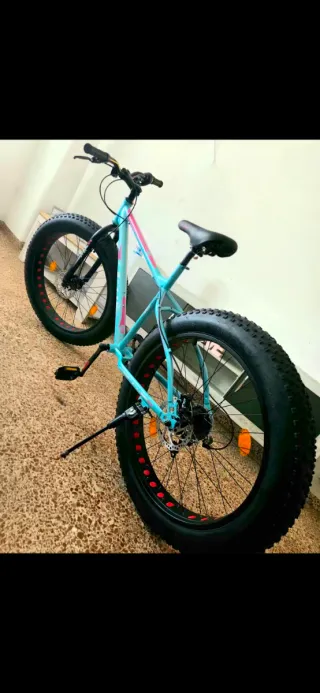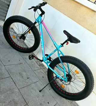 Bicicleta de montaña con ruedas anchas. - Aro de 26 pulgadas. - Neumáticos tipo Fat Bike. - Color azul con detalles rosas y blancos. - Frenos de disco. - Diseñada principalmente para nieve, playa, grava y montaña. - Se ha usado muy poco como se puede ver en las fotos.