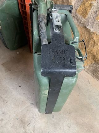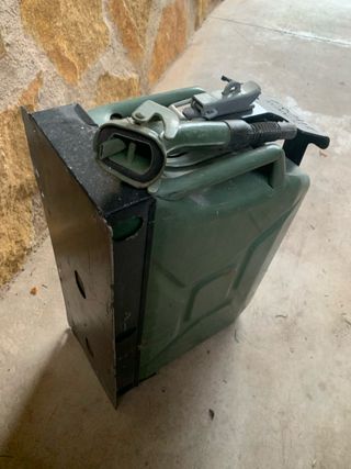 Jerrycan de 20 litros con soporte y boquilla para vaciado. - Color verde. - Material metálico resistente.