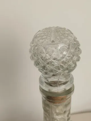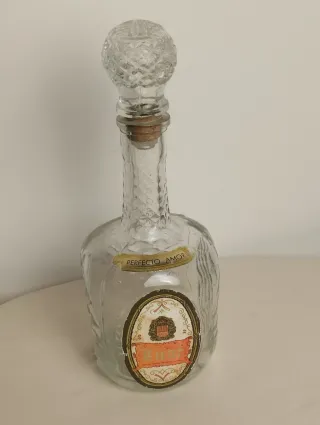Botella de licor antigua con un diseño texturizado y un tapón de cristal labrado. - Etiqueta Perfecto Amor. - Tapón de cristal con corcho. Pesa 1kg. y mide 30cm por 11cm.