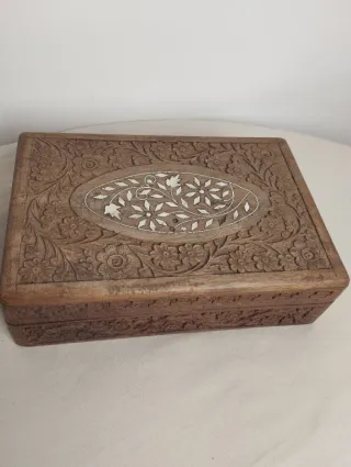 Preciosa caja de madera con un intrincado tallado a mano y detalles incrustados - Diseño floral ovalado en la tapa. - Tallado detallado en toda la superficie. - Material: Madera. caja de baratijas vintage tallada a mano, caja con incrustaciones, joyero.
