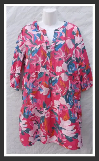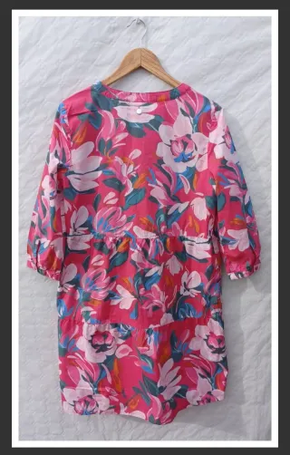 Vestido de corte holgado con un vibrante estampado floral. Ideal para un look casual y fresco. - Diseño con cuello en V y manga 3/4. - Varios niveles con volantes. - Estampado multicolor con predominio del rosa.