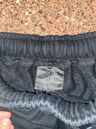 Pantalones cortos negros con diseño gráfico. - Cintura elástica con cordón. - Bolsillos laterales. - Estampado gráfico grande en las perneras.