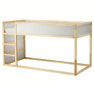Cama Kura de Ikea, reversible, en color blanco y pino. Perfecta para optimizar el espacio. - Medidas: 90x200 cm. - Estructura de madera de pino. - Paneles laterales blancos.