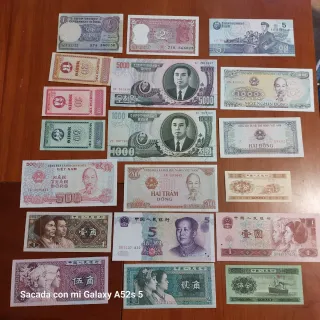 Lote de 40 billetes de diferentes países asiáticos. Una colección variada para aficionados. - Incluye billetes de India, Vietnam, Mongolia y Corea del Norte. - Diseños y denominaciones diversas. - Ideal para coleccionistas.