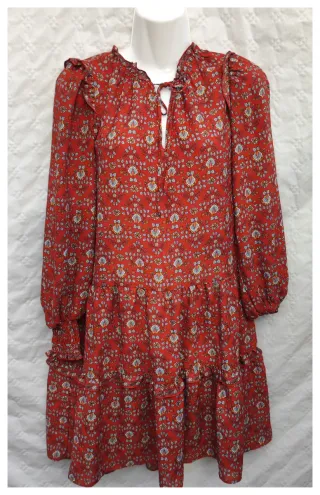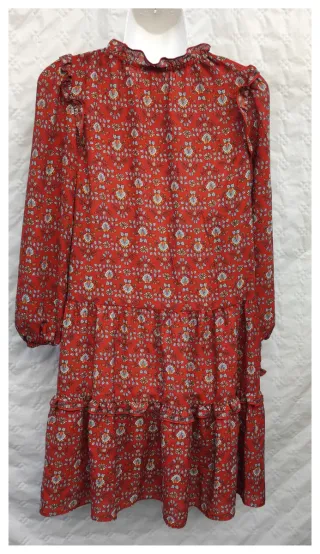 Vestido de manga larga con estampado floral en tonos rojos y multicolores. Presenta un cuello con lazada y volantes. - Diseño con volantes en mangas y bajo. - Estampado floral detallado. - Cuello con lazada y detalle de volantes.