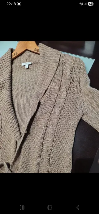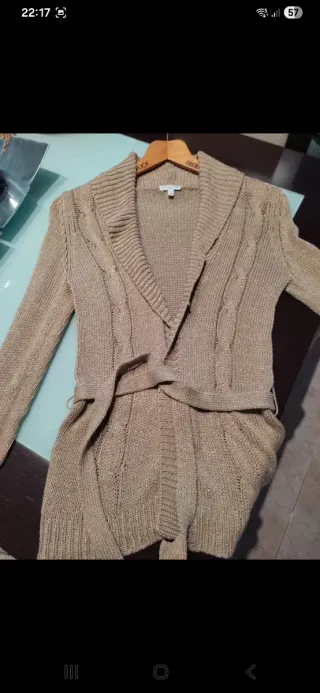 Chaqueta de punto con cinturón. - Diseño de trenzas. - Cuello envolvente. - Manga larga. Chaqueta de mujer abierta, con cinturón, el color es como un marrón con matices dorados.