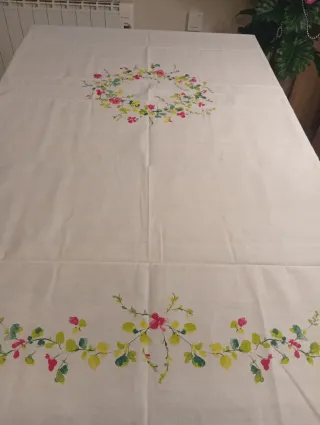 Mantel blanco con un bonito estampado floral en tonos rosas y verdes. Ideal para dar un toque de color a tu mesa. Medidas 180X180 - Diseño de guirnalda floral en la parte superior. - Borde decorado con un patrón de ramas y flores.