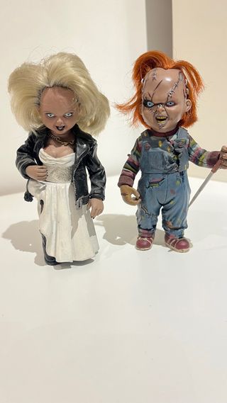 Set de figuras de Chucky y Tiffany, personajes icónicos del cine de terror. - Figura de Chucky con su característico mono y camiseta a rayas. - Figura de Tiffany vestida de novia con chaqueta de cuero.