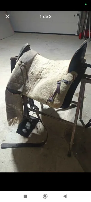 Montura de estilo vaquero, con un diseño tradicional y materiales resistentes. - Asiento acolchado para mayor comodidad. - Estribos de cuero. - Detalle de flecos en la parte trasera.