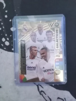 Tarjeta de colección Panini Míticos Invencibles Galácticos. - Jugadores del Real Madrid. - Diseño con jugadores icónicos. - Incluye estadísticas de los jugadores.