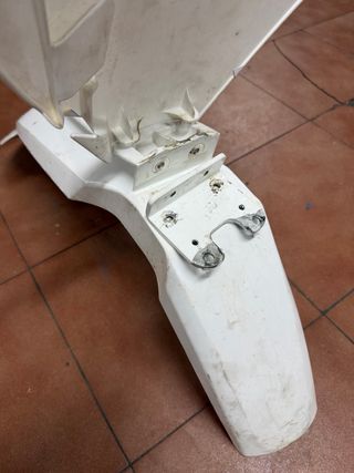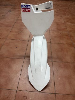 Pieza de plástico blanca para moto KTM, incluye guardabarros y careta y una pletina para adáptarlo a ktm exc del 2015 que es donde estaba puesto no sé si será válido para mas modelos como la sx,sxf - Guardabarros delantero. - Careta frontal.