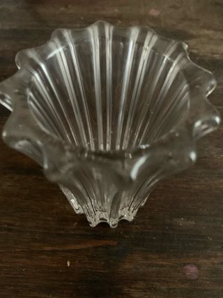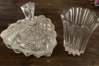 Preciosa pareja de piezas de cristal. Ideal para decorar cualquier espacio con un toque elegante. - Polvera con tapa de cristal tallado con forma de corazón. - Florero de cristal transparente con diseño acanalado. - Ambos en perfecto estado.