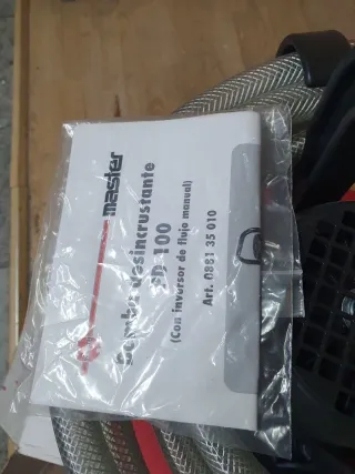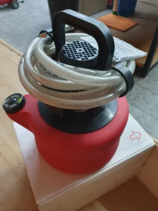 Herramienta eléctrica para desatascar tuberías. Diseñada para facilitar la limpieza de desagües y canalizaciones. - Cuerpo principal de plástico rojo. - Asa de transporte negra. - Manguera de plástico transparente enrollada.