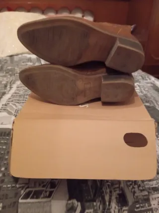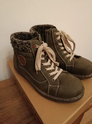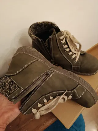 Botas de invierno de nobuk con forrito polar por dentro. Talla 39, color entre kaki y verde oliva. Son de este año y apenas me las he puesto, están impecables. Detalle de tejido en el tobillo. Cierre con cordones y cremallera lateral.